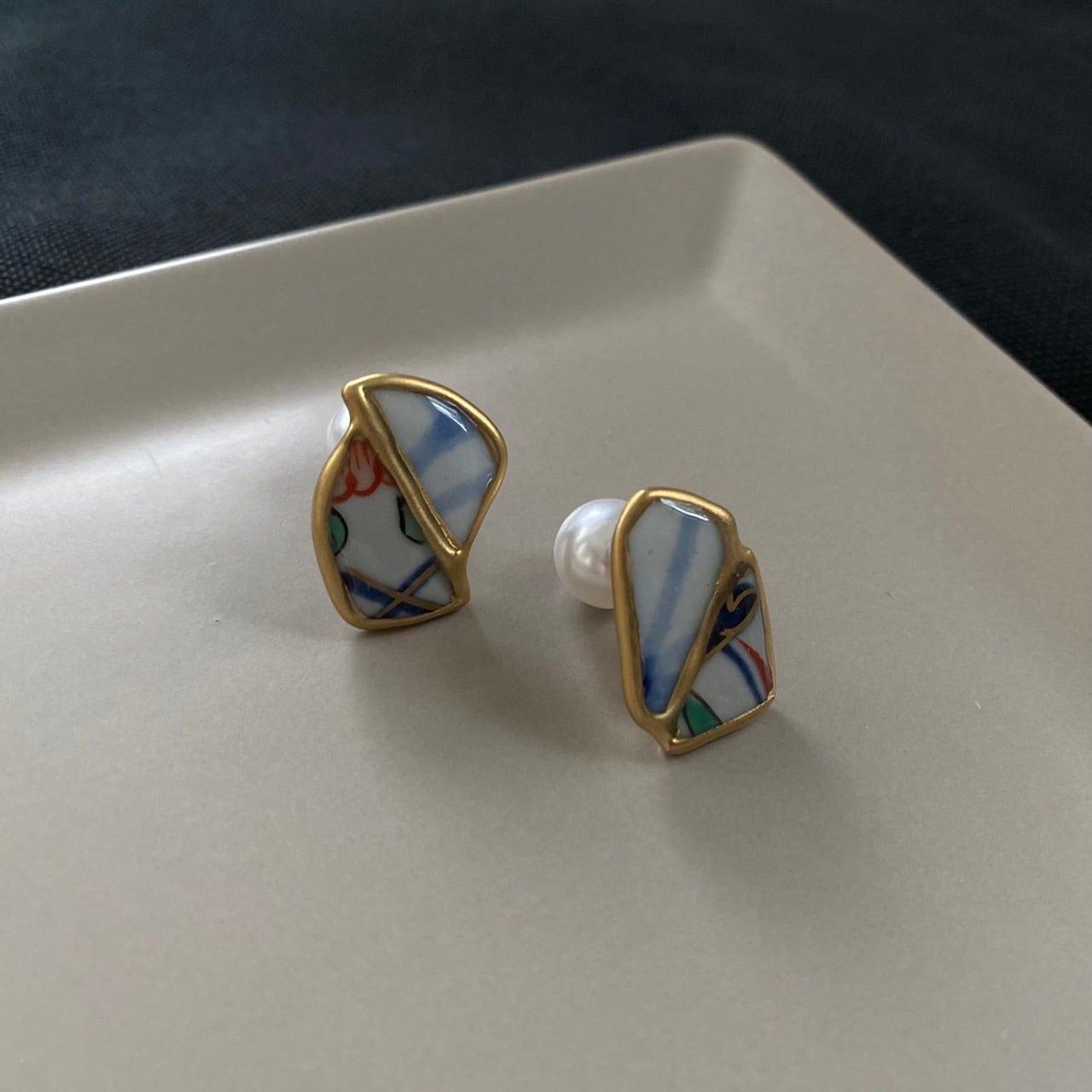 鮮やかな青色と繊細な絵付けが、耳元に華やかさを添えます。五彩と染付の異なる背景を持つ陶片が合わさることで、唯一無二の個性を演出します。